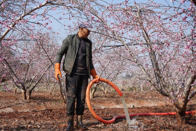 果农抢抓农时进行疏花和浇水施肥,加强对果树的管护,期盼今年的好收成。