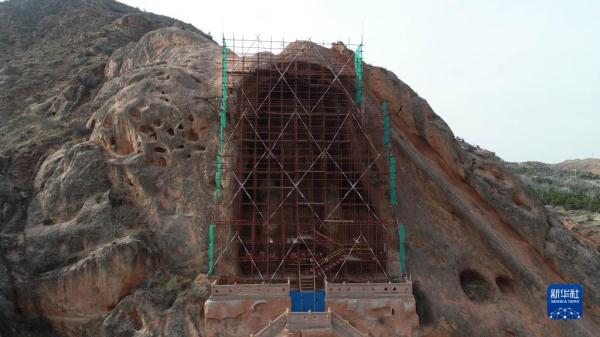 这是宁夏须弥山石窟正在修复中的大佛(2月28日摄,无人机照片)。新华社记者 王鹏 摄