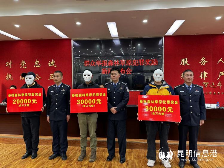 昆明信息港讯 记者合宇聪 3月3日,昆明市公安局森林警察支队召开群众举报森林草原犯罪奖励新闻发布会,通报近期举报犯罪奖励实施情况,并现场为3名举报人颁发奖励金共计8万元,其中个人奖励最高金额为3万元。