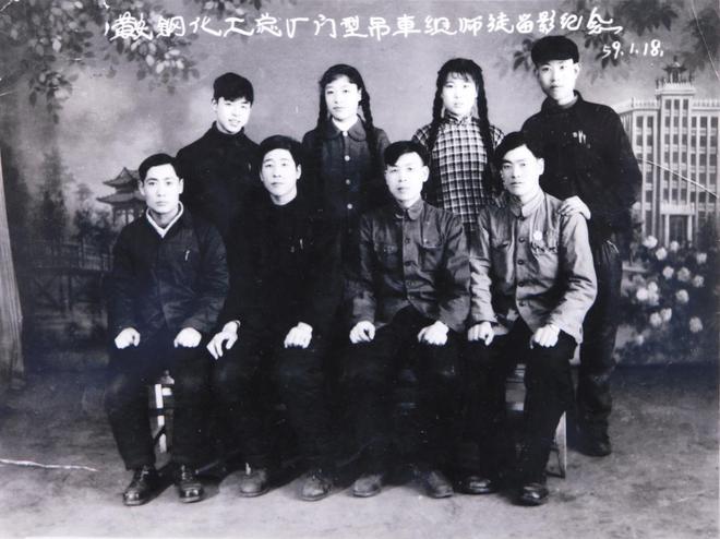 1959年1月18日,鞍钢化工总厂门型吊车班师徒留影纪念(后排左一为雷锋)。鞍钢雷锋纪念馆供图