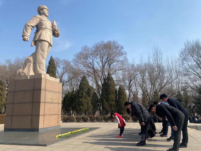 辽宁抚顺雷锋纪念馆雷锋墓前,来自各地的参观者向雷锋像鞠躬致敬。人民网 张磊摄