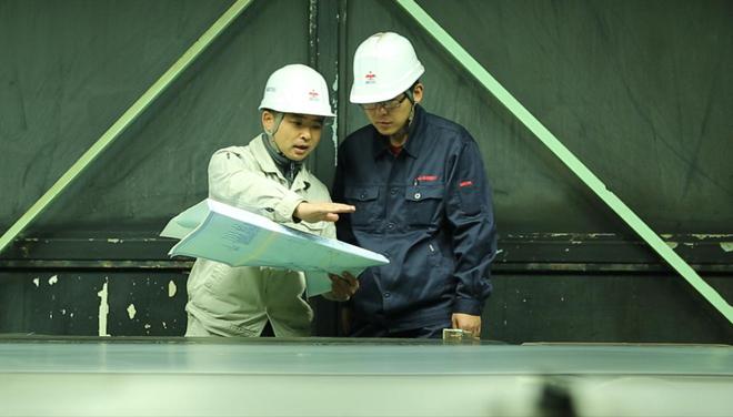 李超(左)在车间与同事交流工作。鞍山钢铁党委宣传部供图