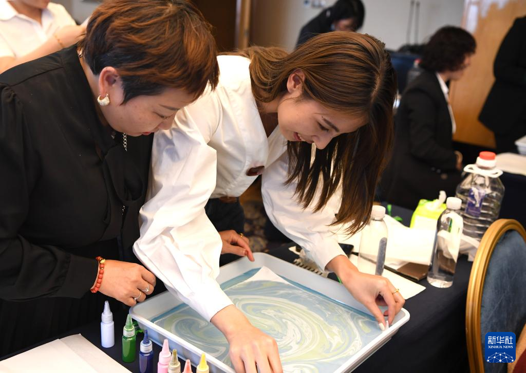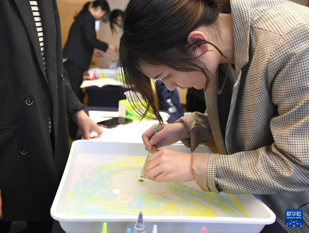 3月4日,中建三局一公司广西分公司在广西南宁市举办“三八”国际妇女节主题活动,数十名奋战在建筑工程一线的女员工在老师的带领下学习水拓画技艺,以独特方式迎接自己的节日。新华社记者 周华 摄