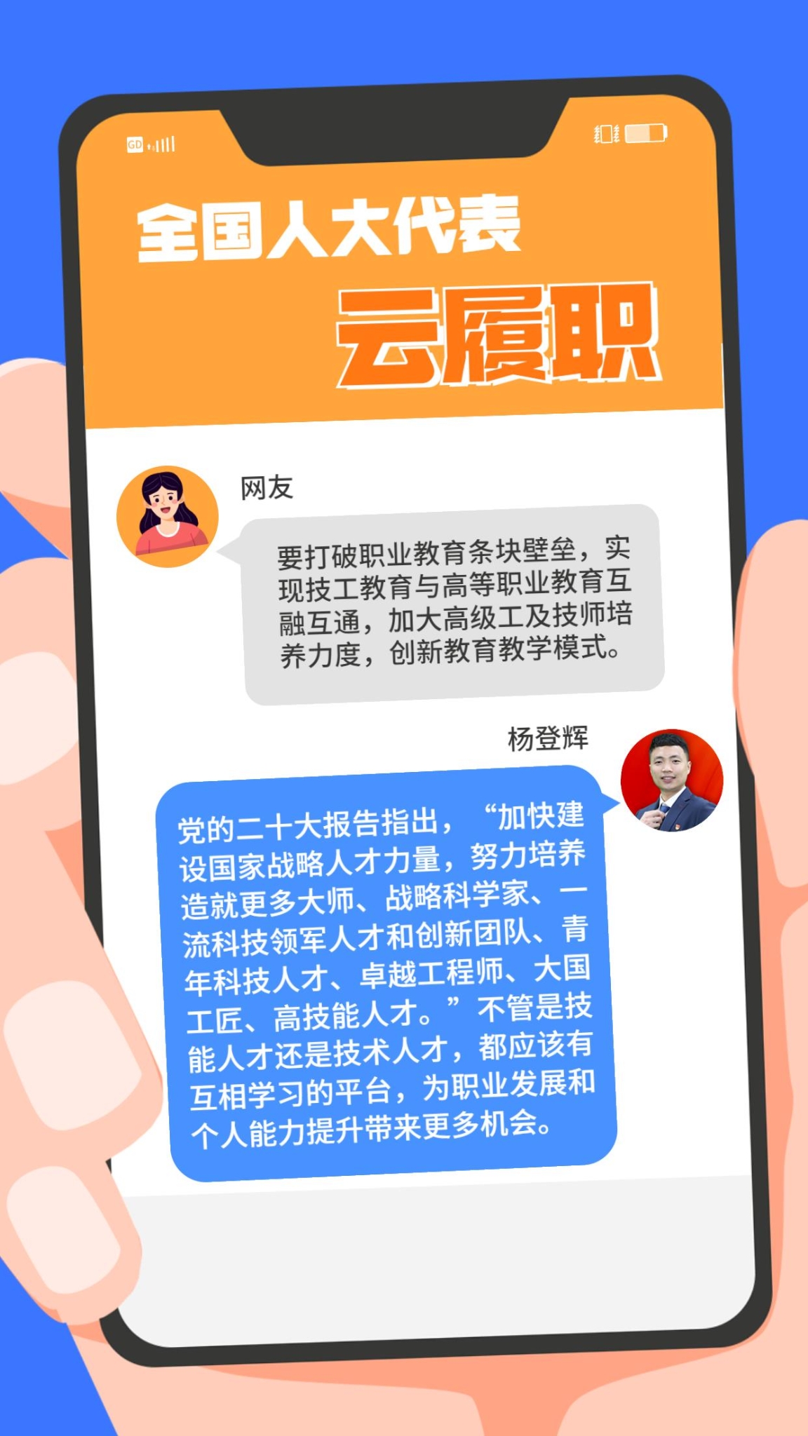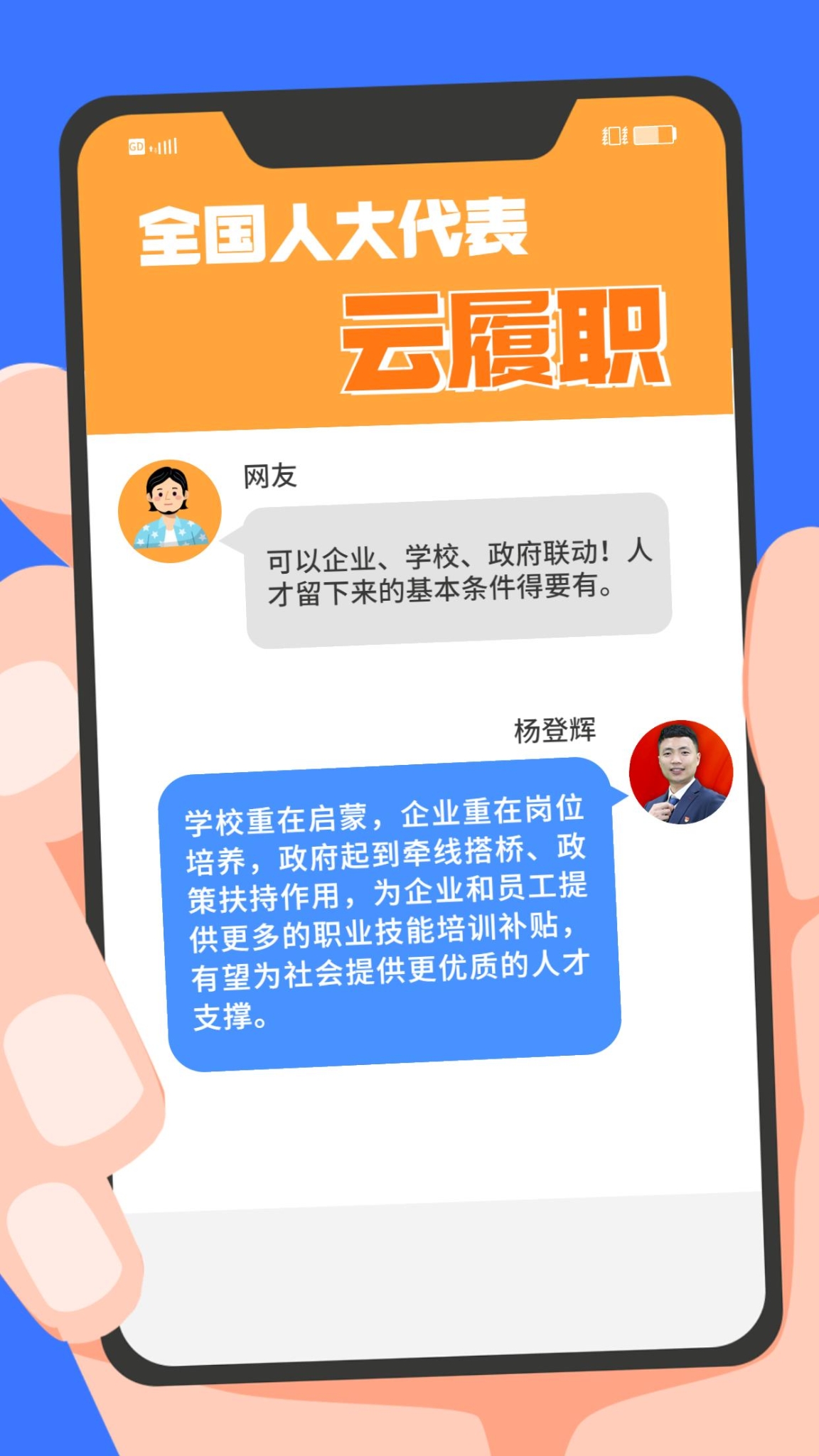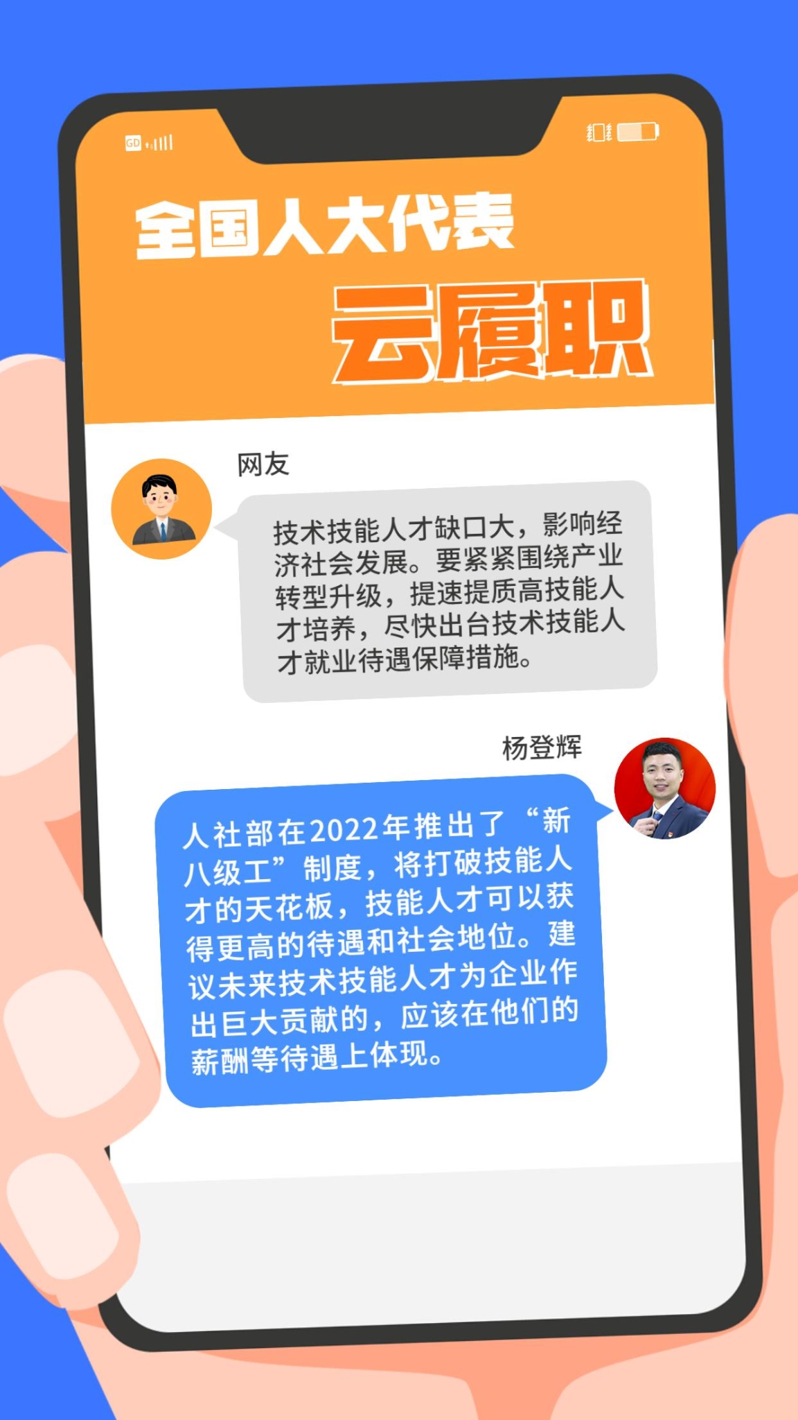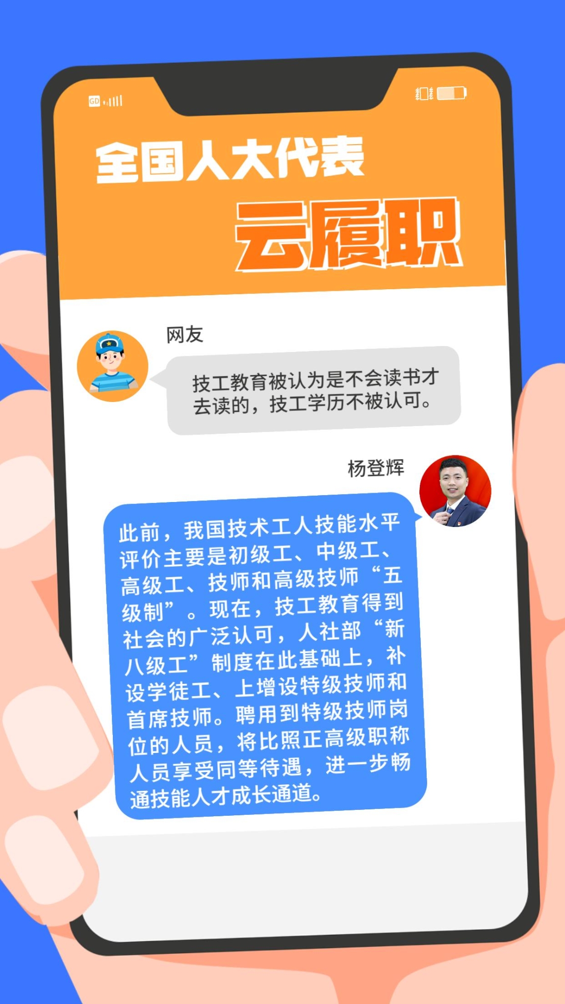 现实中,“技能人才短缺”现象频频出现。针对技能人才的供给与产业发展的实际需求在规模、结构和质量上不对称、不适应等问题,全国人大代表、第44届世界技能大赛冠军杨登辉在赴京履职前,通过线上方式征求网友的意见。对部分有代表性的留言,杨登辉一一作了回复。来看看这位95后全国人大代表怎么说↓↓↓