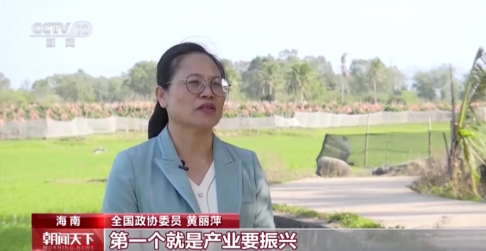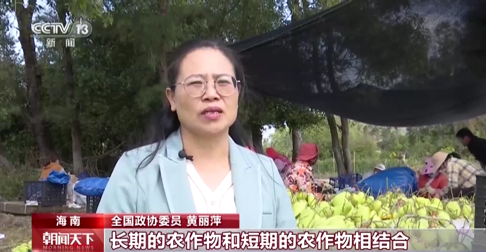 全国政协委员 黄丽萍:长期的农作物和短期的农作物相结合,长期的农作物就是我们的芒果树和我们的荔枝、龙眼;短期的就是我们的反季节瓜菜,还有一个就是务工就业。这样形成一个收入链,让老百姓的收入在持续,所以一年平均下来每个月都有收入。