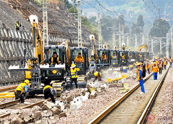 3月8日15时,在南(宁)昆(明)铁路石林南站,伴随着施工命令的下达,30多台大型机械设备一字排开,轰鸣作响,开始进行线路换枕作业,标志着西南最大扶贫工程——南昆铁路全面展开大修施工,将进一步改善线路设备状态,保障列车运行安全,提升通道运输效率。