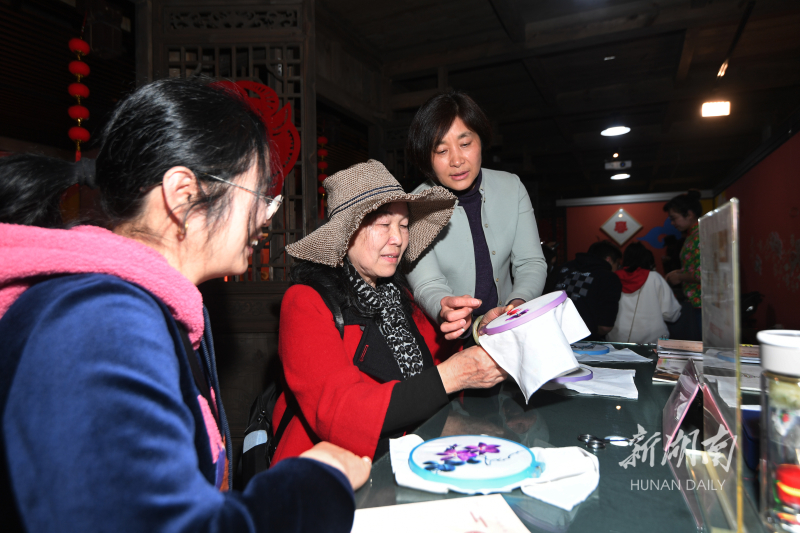 3月8日,长沙非物质文化遗产馆,女同胞们在体验非遗项目——湘绣。