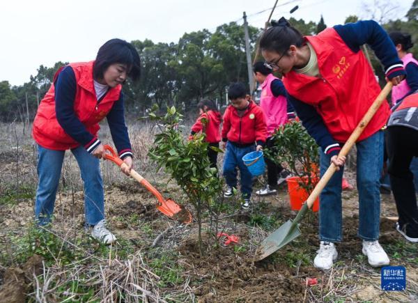 3月8日,在长兴县李家巷镇青草坞村的荒地上,孩子们在老师和青草坞村党员志愿者的带领下一起种下橘子树苗。