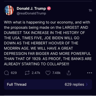“乔·拜登将作为现代时期的赫伯特·胡佛被载入史册。我们将经历一场比1929年更大、更严重的大萧条。证据就是,银行已经开始倒闭了!”