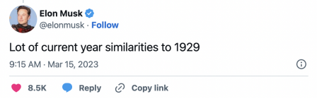 3月15日,马斯克在推特上表示,“如今的年景和1929年非常相近”。