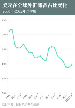 据国际货币基金组织(IMF)的数据显示,去年第二季度,美元在全球官方外汇储备资产中占比约为59.5%,相比2001年72.7%的美元占比明显下降。