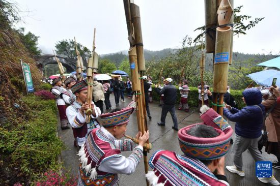 3月19日,在广西融水苗族自治县双龙沟森林旅游度假区,苗族同胞用歌舞欢迎来自广东省湛江市的游客。