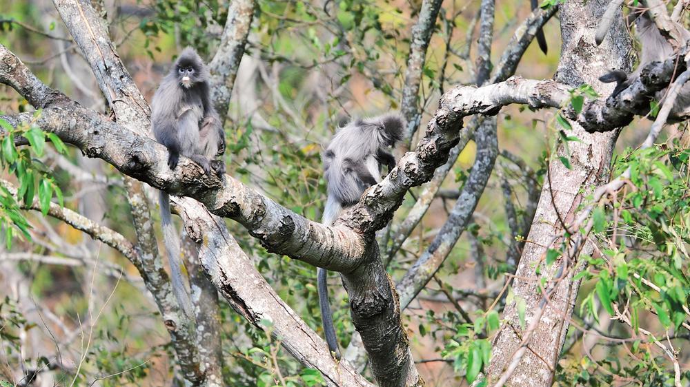 日前,新闻工作者在施甸县善洲林场东南山麓的旧城芦子园境内拍摄到一群国家一级保护动物印支灰叶猴的家庭生活场景,14只印支灰叶猴同框出镜,尽显温馨和谐。