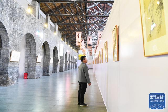 ↑3月21日,参观者在遂平县1955工业文化创意园的老厂房内参观画展。新华社记者 张浩然 摄