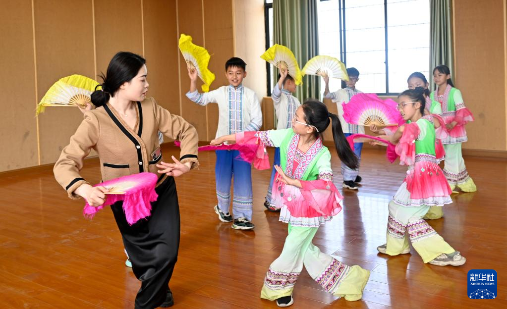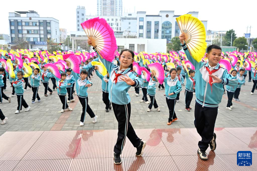 近年来,广西柳州市柳城县教育部门把彩调的一些曲目编排成简单易学的校园广播操,并逐步在该县的各小学推广,丰富校园文化生活的同时,也让学生感受到非遗文化的魅力。彩调剧作为广西地方传统戏剧,被列入第一批国家级非物质文化遗产名录。新华社发(黎寒池 摄)