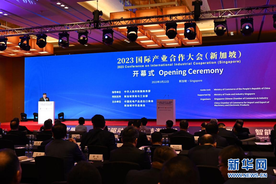 3月22日,2023国际产业合作大会(新加坡)暨中国机电产品品牌展览会在新加坡滨海湾金沙会议展览中心举行开幕式。图为开幕式现场(新华网 陈冰 摄)