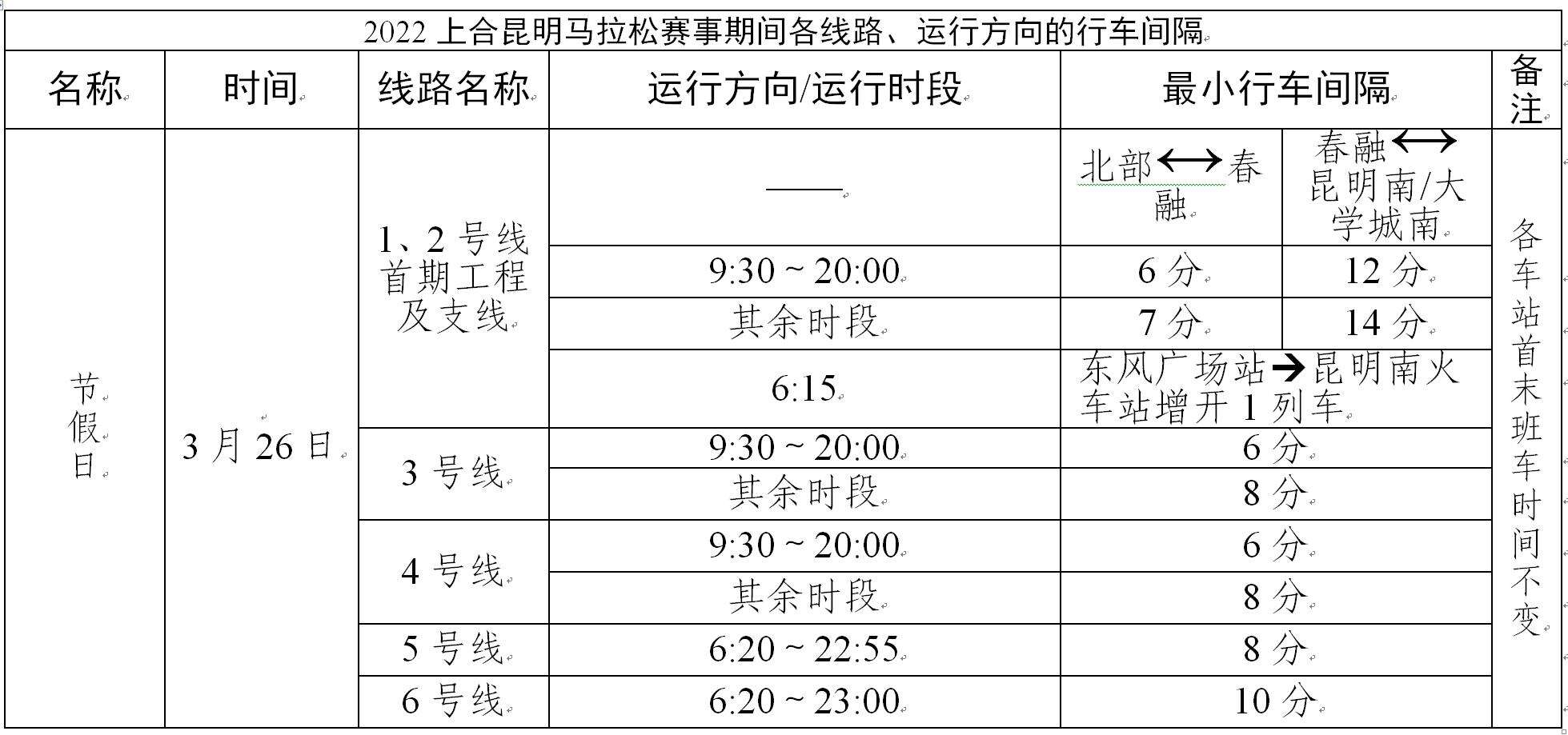 2022上合昆明马拉松赛事期间按双休日运行图正常组织行车。遇特殊情况,以上级部门下达的通知为准。