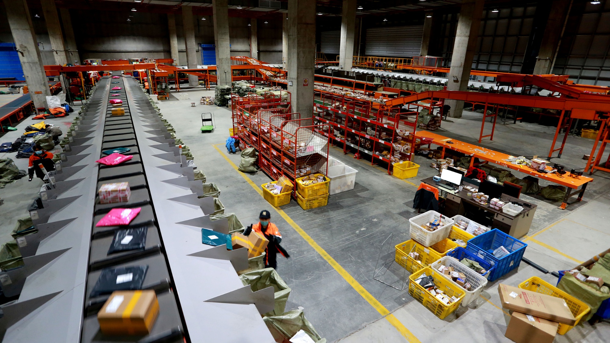 资料图:河南三门峡,工作人员物流园内分拣包裹