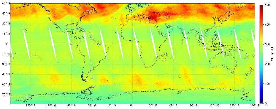 图为高光谱综合观测卫星全球臭氧柱浓度监测图,清晰揭示臭氧全球分布,与国外同类卫星的监测结果相比趋势一致,可有力支撑大气污染防治、全球气候变化研究等。(国家航天局供图)