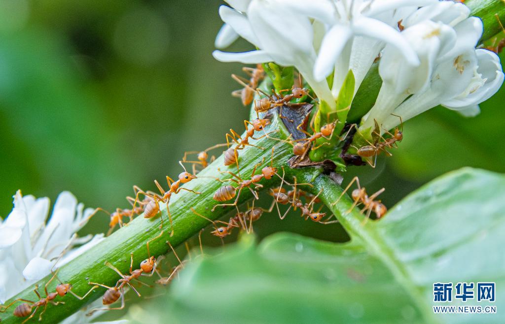 黄猄蚁在咖啡树上觅食(3月15日摄)。新华网发(郭康 摄)