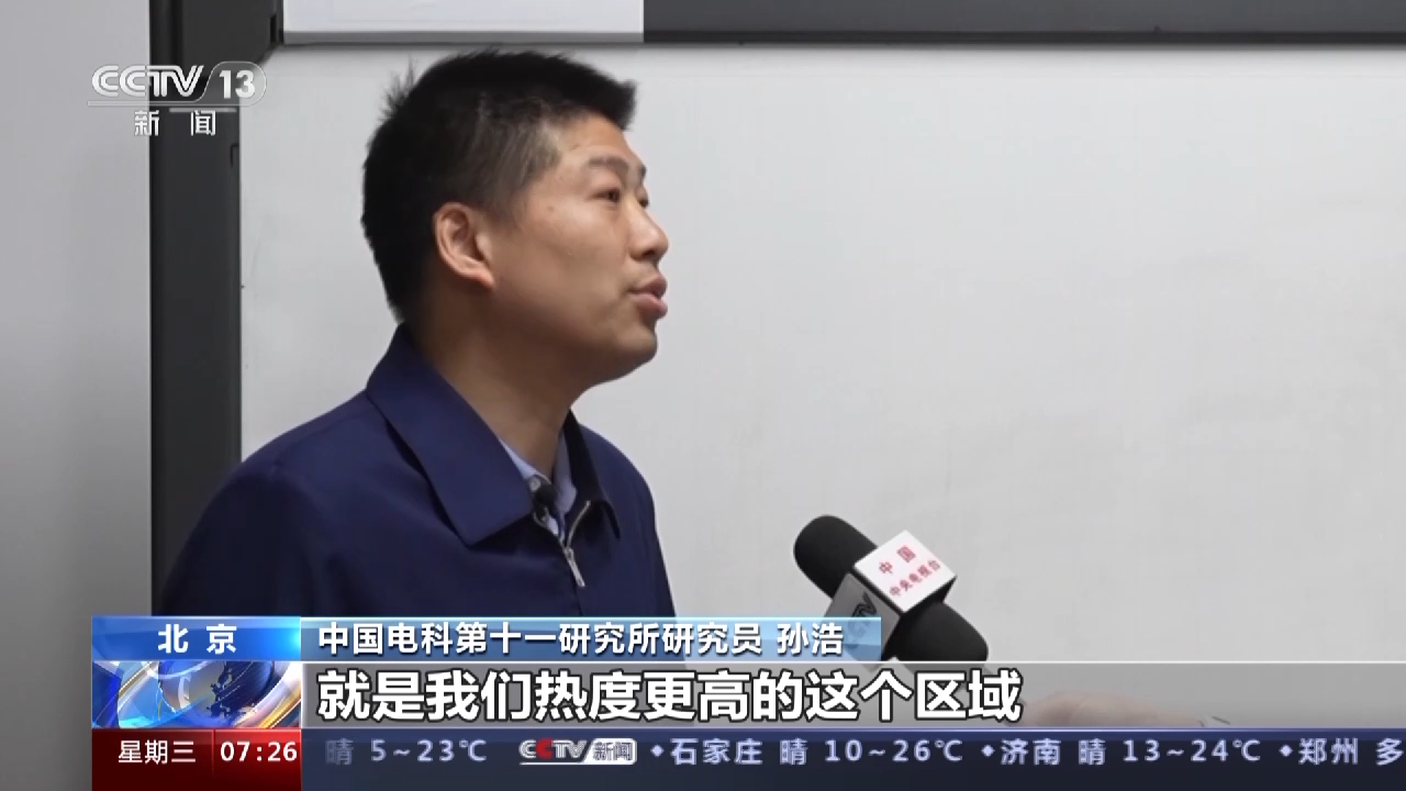 中国电科第十一研究所研究员 孙浩:这是我们研制的卫星载荷用的红外探测器原理样机。图像上显得更白的一个地方,就是我们热度更高的这个区域。然后像如果我们手部的话,放在我们的衣服上,就可以感觉出来我们衣服上就会出现一个变化,就是温度更高的区域。我们根据这些信息就可以获取我们所需要的各种温度的信息,作为我们判断一些事情的依据。