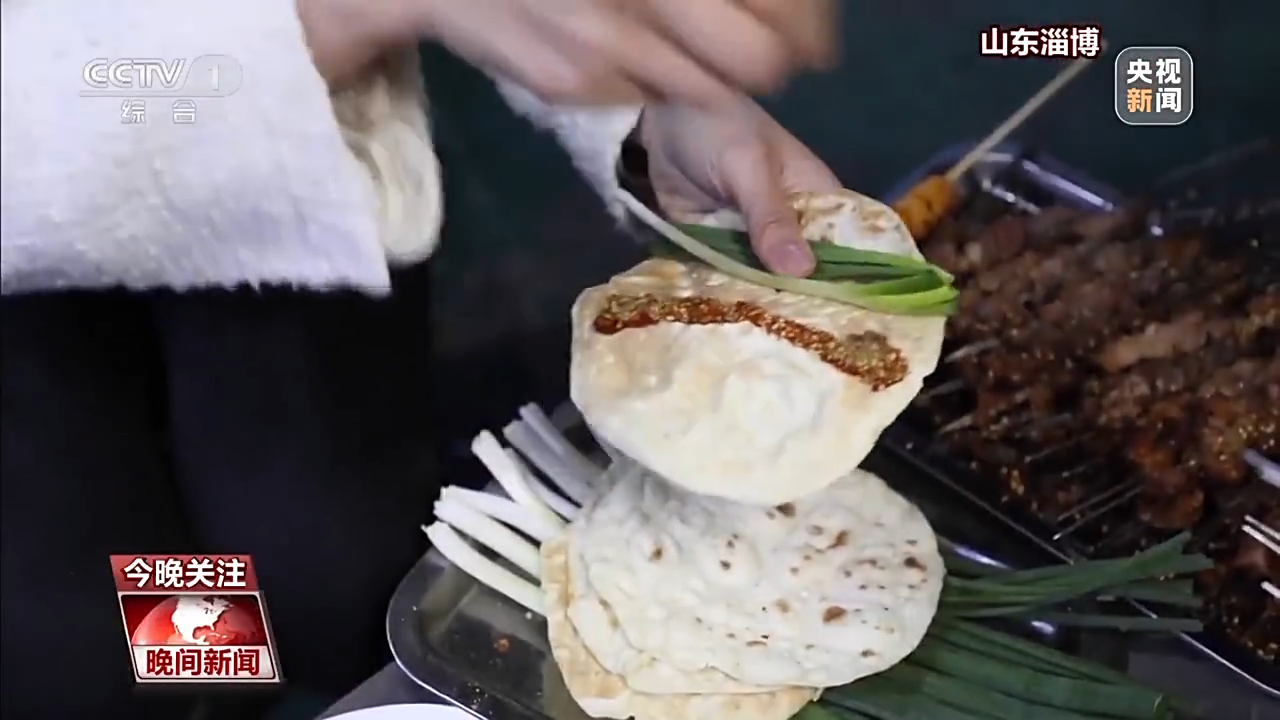 正味烧烤老板 刘静:一蘸这个酱,然后蘸料。很多种吃法都有了,说小炉子代表温度,小饼代表包容,小葱代表豪爽。这就是我们淄博,常来我们淄博。