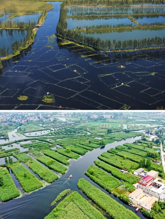 拼版照片:上图为2012年9月29日拍摄的白洋淀(金洁 摄);下图为2021年8月14日拍摄的白洋淀风光(无人机照片,新华社记者牟宇摄)。