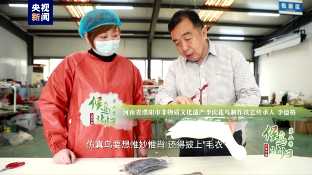 河南省濮阳市非物质文化遗产李氏花鸟制作技艺传承人 李德格:总共需要7种毛,大约有600多片。一个比较熟练的工人要粘好它,至少得要四个多小时。