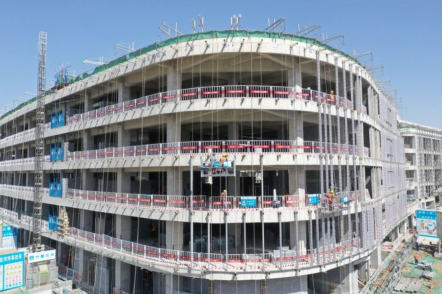 在雄安新区启动区,工人在中国卫星网络集团有限公司雄安总部施工现场作业(3月15日摄,无人机照片)。