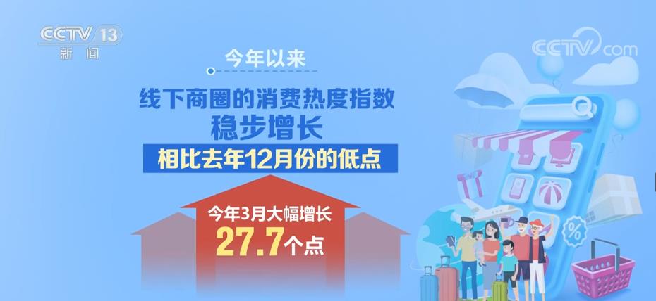 记者采访过程中发现,根据国家信息中心对全国重点商圈每日互动人流量数据分析,今年以来,线下商圈的消费热度指数稳步增长,相比去年12月份的低点,今年3月大幅增长了27.7个点。春风吹暖春经济,这个春天,居民线下消费持续火热。