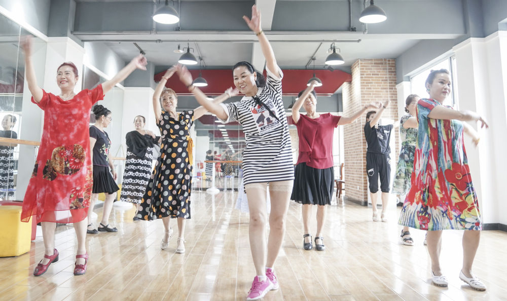 居民们在武汉市青山区棚改安置小区青和居社区活动中心练舞(2019年7月30日摄)。新华社记者程敏/摄