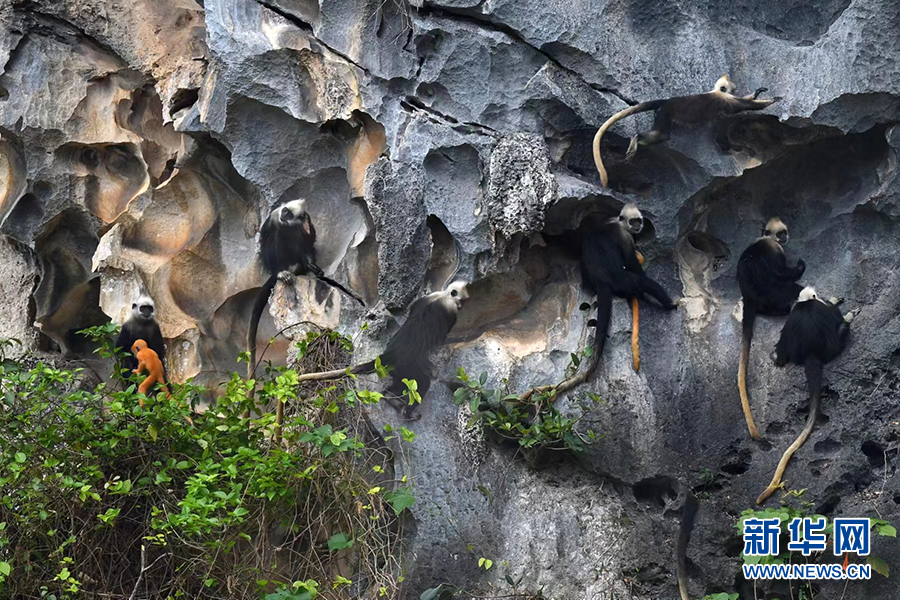 近年来,崇左市通过实施栖息地恢复工程、饮水工程、生态廊道建设工程等措施,目前白头叶猴种群数量已超过1400只。(摄影:张小宁)
