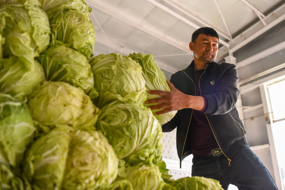 在阿克陶县国投公司分拣中心,员工将大白菜卸车(3月27日摄)。新华社记者丁磊 摄
