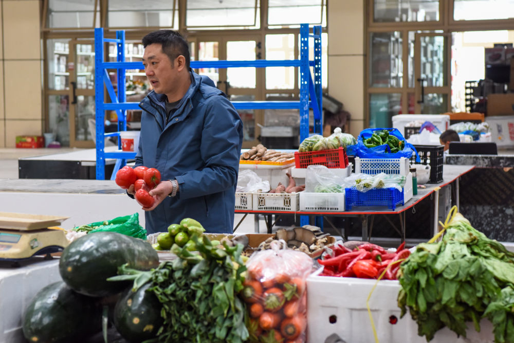 在新疆阿克陶县惠民市场,居民在选购蔬菜(3月27日摄)。新华社记者丁磊 摄