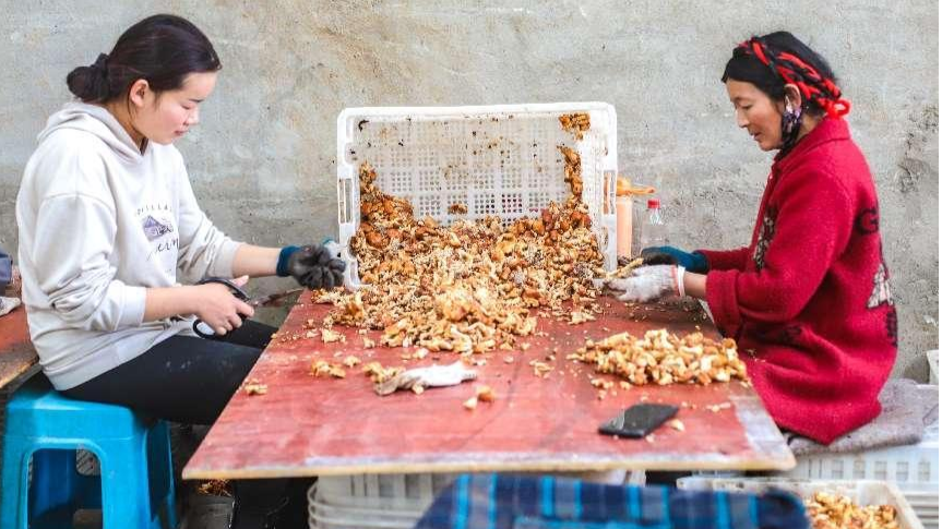 在园区挑选松茸的村民(央广网发 中共雅江县委宣传部供图)
