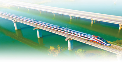 中老铁路“澜沧号”动车组列车奔驰在老挝万象省境内的欣楠里河特大桥上。