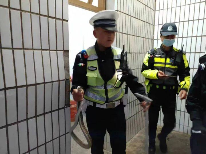 民警随即赶往这名群众家中。到达求助人家中后,民警在卫生间中发现了这条一米多长的蛇。 通过观察,确认是菜花蛇无毒后,民警徒手将其抓获。随后,民警将蛇交与派出所民警保存在密闭的装置里带走,求助居民连连表示的感谢。
