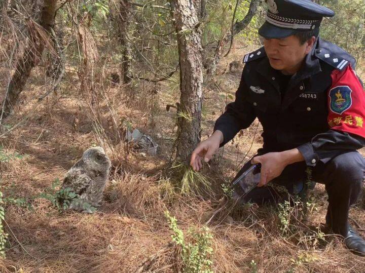 经鉴定,这只幼鸟为领角鸮,是国家二级保护动物,属猫头鹰的一种。民警在检查小猫头鹰没有外伤后,民警驱车将小猫头鹰放回山林。