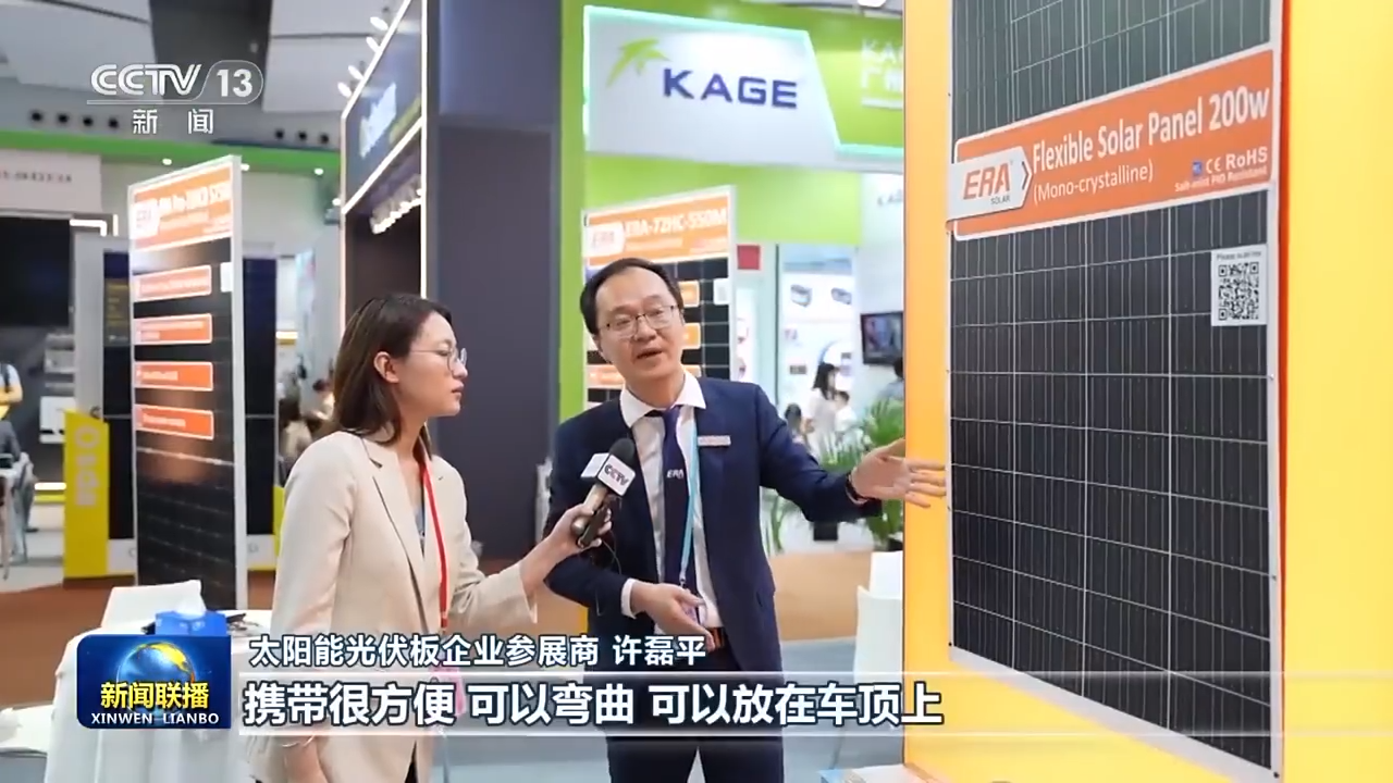 太阳能光伏板企业参展商 许磊平:携带很方便,可以弯曲,可以放在车顶上,可以给太阳能汽车充电。