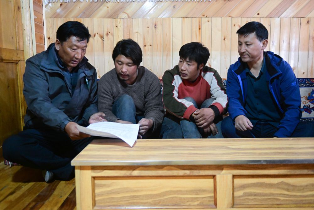 3月24日,在青海省黄南藏族自治州泽库县麦秀镇龙藏村,麦秀林场护林员(左一)在牧民家中宣传防火知识。(新华社记者 张龙 摄)
