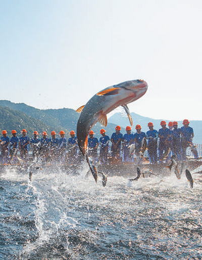 浙江省杭州市淳安县千岛湖国家级水产种质资源保护区内,渔民在进行“巨网捕鱼”。谢航凯摄(影像中国)