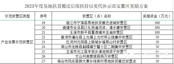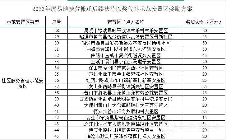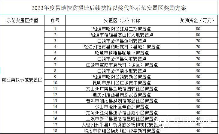 根据2023年度易地扶贫搬迁后续扶持以奖代补方案,此次奖补项目包含就业帮扶、产业发展、社区服务管理示范安置区奖励资金2500万元;“补短板、促发展”项目补助资金2500万元。其中,对昭通市昭阳区红路二期安置点、昭通市镇雄县高山村大地安置点等18个就业帮扶示范安置区奖励资金1000万元;对丽江市宁蒗县易地扶贫搬迁进城安置区、曲靖市会泽县以礼街道河滨、清水碾安置区等9个产业发展示范安置区奖励资金1000万元;对昆明市禄劝县皎平渡镇杉乐村杉乐安置区、昭通市鲁甸县砚池街道卯家湾安置区景新社区等18个社区服务管理示范安置区奖励资金500万元;对昆明市东川区进城集中安置区、曲靖市宣威市乐丰集镇安置点等16个安置区“补短板、促发展”项目补助资金2500万元。奖补资金主要用于安置点发展农业特色优势产业、建设扶贫车间和解决搬迁群众“急难愁盼”问题等,以发挥示范引领作用。
