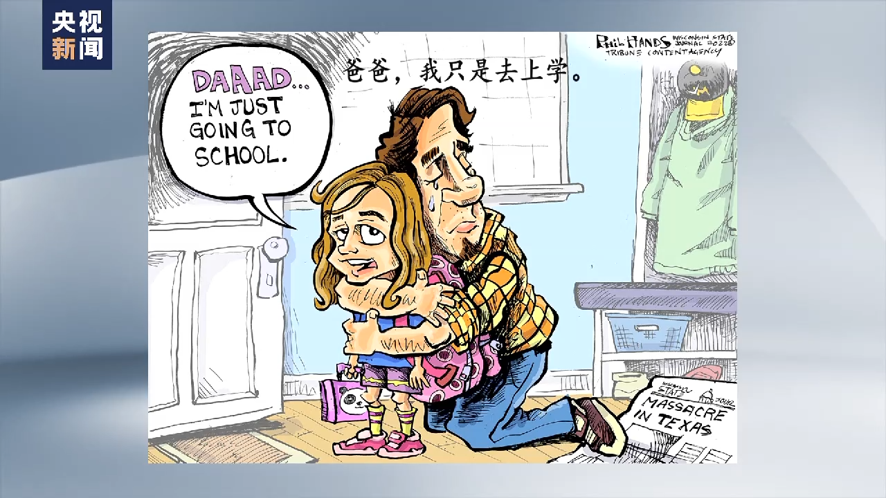 正如这张漫画所展示的,在得州枪支暴力的背景下,一位父亲流着泪抱紧自己的女儿,而小女孩说,爸爸,我只是去上学。