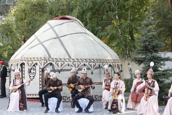 ↑身穿民族服饰的演奏者在吉尔吉斯斯坦首都比什凯克用传统乐器合奏音乐。