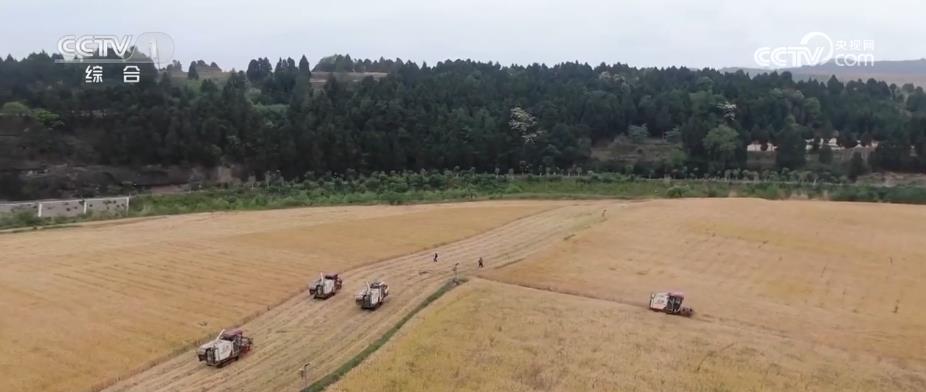 在四川梓潼,24.68万亩小麦日前喜获丰收。为了确保粮食安全、及时收割入库,当地组织1000余台联合收割机全力抢收成熟小麦。联合收割机在金色的麦浪中来回穿梭,机器过后留下一排排整齐的麦茬,切割、剥壳、脱粒在农机驾驶员的操作下一气呵成。同时,秸秆就地粉碎还田,为后续种植2.03万亩大豆、26万亩玉米打好基础。