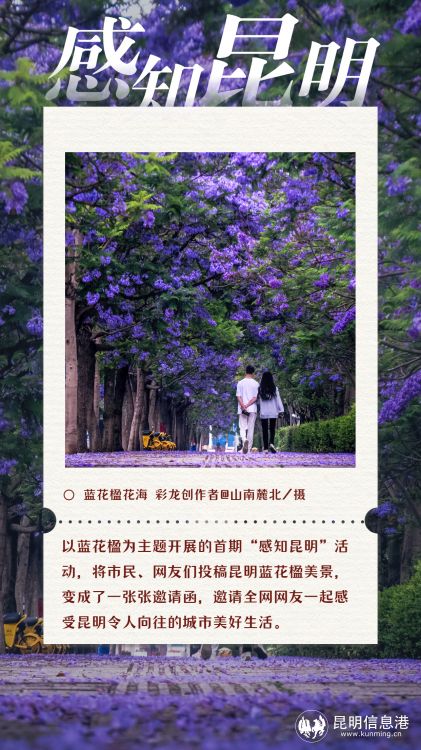 5月,正值蓝花楹盛花期,昆明的大街小巷被蓝花楹覆盖,而这一抹抹“夏日限定”也吸引了无数市民、游客前往打卡,在花海中感受昆明的美好与浪漫。定格春城美景,感知城市美好。由昆明信息港策划推出的“感知昆明”大型融媒体联合展播活动于5月9日正式启动,以蓝花楹为主题开展的首期活动,则将市民、网友们投稿昆明蓝花楹美景,变成了一张张邀请函,邀请全网网友一起感受昆明令人向往的城市美好生活,共同讲述一种叫云南的生活。(昆明信息港评论员 李欣怡)