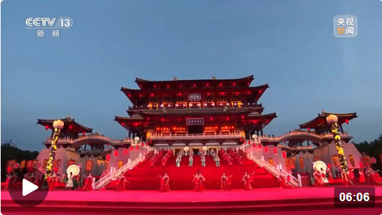△紫云楼是大唐芙蓉园最主要的仿唐建筑群之一。18日晚的迎宾表演就是以紫云楼为背景。(总台央视记者刘琦拍摄)