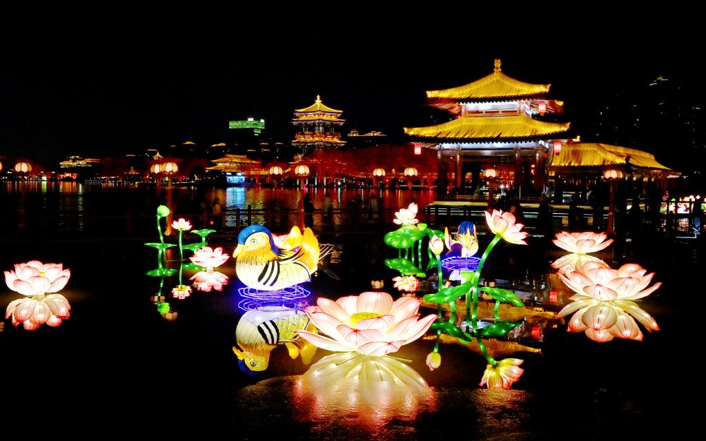 2023年1月24日在西安大唐芙蓉园拍摄的花灯(无人机照片)。新华社记者 刘潇 摄