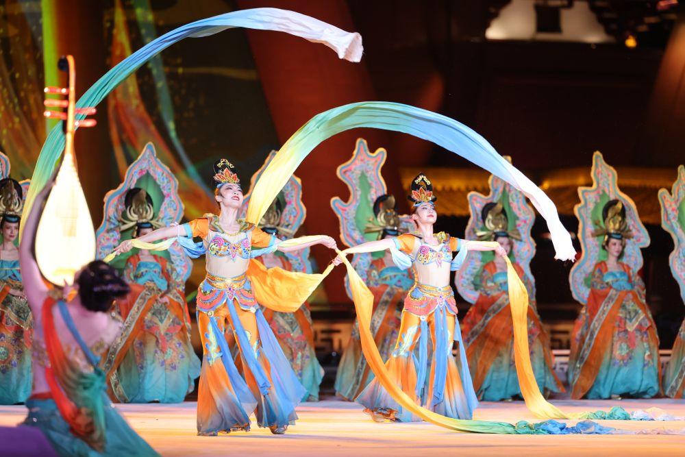 秦俑舞者踏着铿锵鼓点步伐齐整,敦煌舞者闪转腾挪,反弹亮色琵琶。一曲恢弘典雅的《秦风唐韵》,叩开厚重的历史大门,重现古老文明的赫赫荣光。