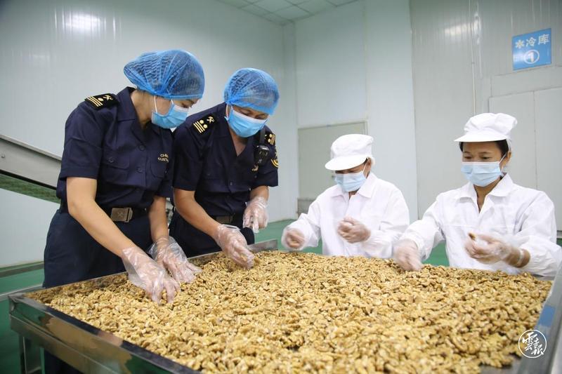 图为海关关员在企业对出口核桃进行监管 通讯员 李易霖 摄
